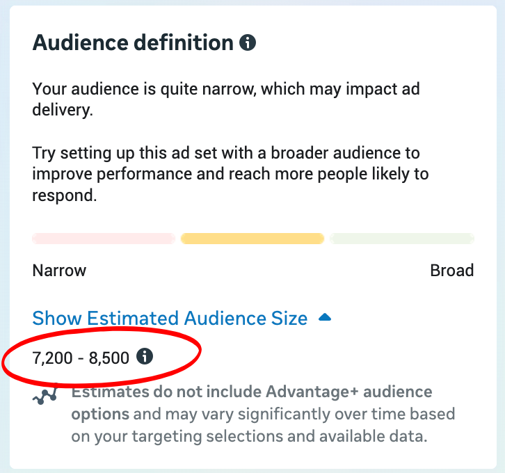 This business sells Brooks running shoes. Using Meta’s interest targeting, they selected “Brooks Running” as an interest in Tuscaloosa; the audience was 8,500 people.